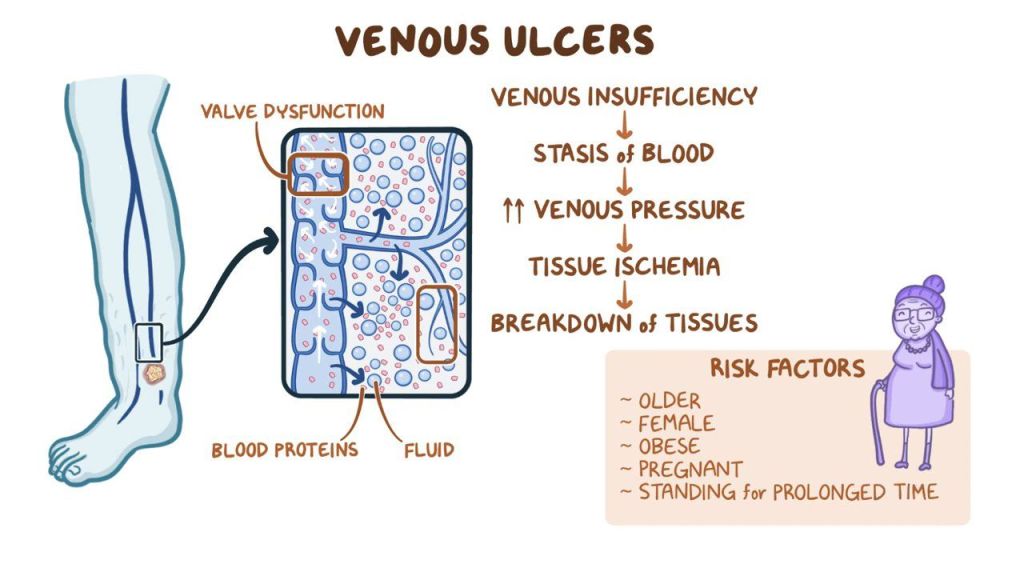 Venous ulcers are open sores in superficial or deep veins, usually in the lower extremities. Venous ulcers occur when a vein stores blood in the heart without returning it to the heart. If left untreated, pressure builds up in the affected area and fluid builds up and blisters. These lesions heal slowly and usually occur above the ankles.